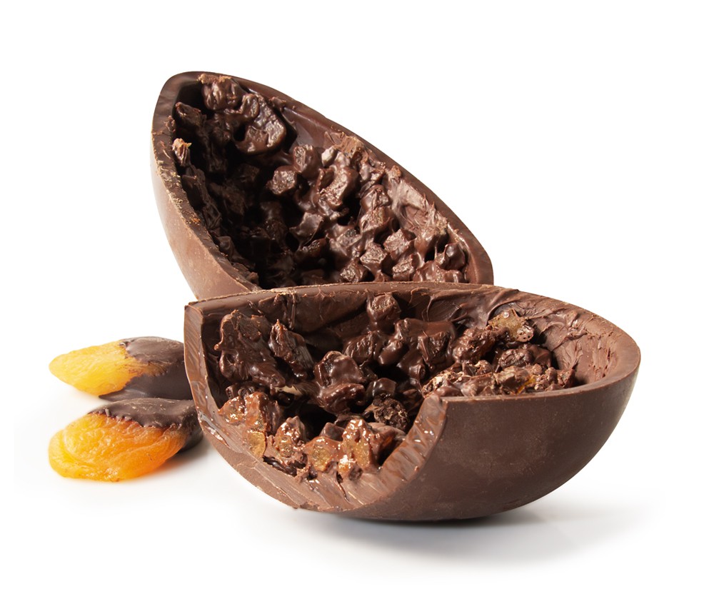 Casca do melhor chocolate amargo 70% cacau nacional lotada de pedaços de damasco, dentro do ovo damascos super macios cobertos com o mesmo chocolate.