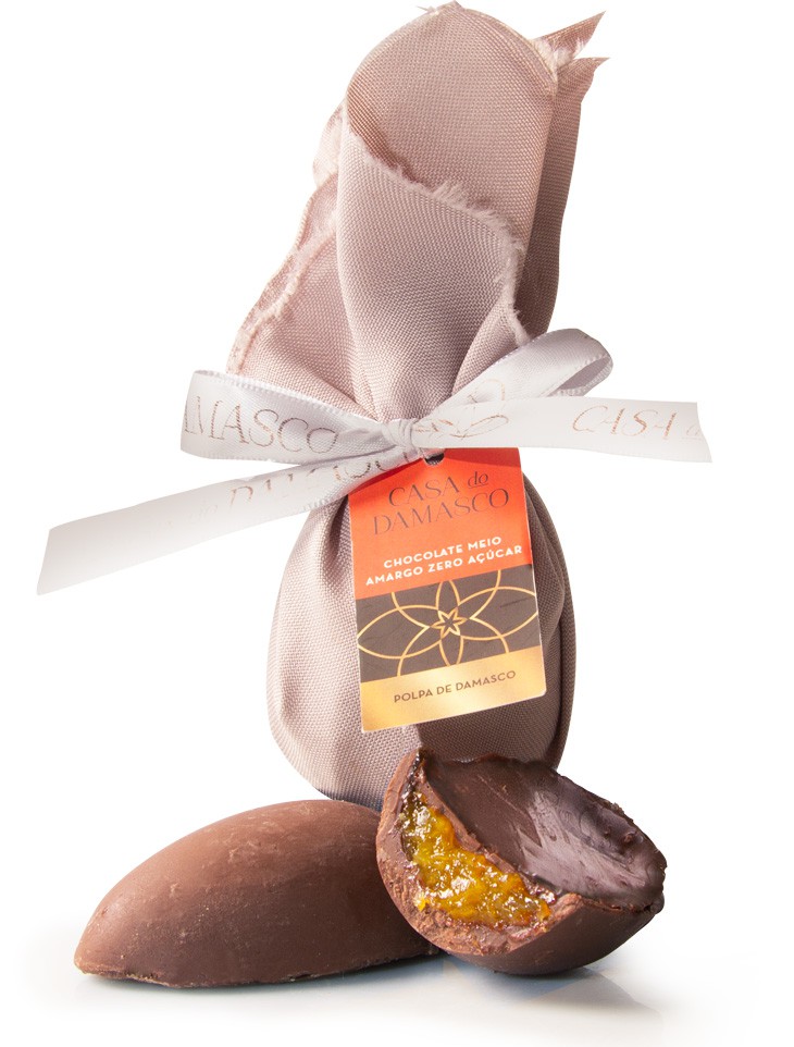 Feito com o chocolate BELGA (Malchoc-D Callebaut) meio amargo 54% cacau 0% açúcar (adoçado com Maltitol) recheado com com nossa polpa in natura de damasco, também sem adição de açúcar.